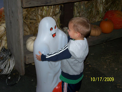 Yesterday we went to pick out pumpkins. There's a huge pumpkin farm with a corn maze and a pumpkin launcher about 45 minutes away from here in Hollister. The plan was to go there. Ty had another plan. For the past 4 days he's been waking up at 3am screaming and wanting to eat. It could be from a million things....growth spurt, teething, traveling....who knows. All I do know is that Tom and I have been very spoiled with a baby who sleeps through the night that once he doesn't.... we're lost. Anyway, so with a baby who was pretty off schedule we went to a pumpkin patch about 5 minutes away. Much easier!!! :-) It was perfect, not crowded and Jack had a blast of course. We haven't carved them yet, that'll be the project for this week. We decorated the house today so it's starting to feel a little like October here. I wish we were back in PA so we could go around the neighborhood trick or treating with my younger cousins. Instead, we'll just be hanging out in our front yard handing out candy. I love Halloween!
